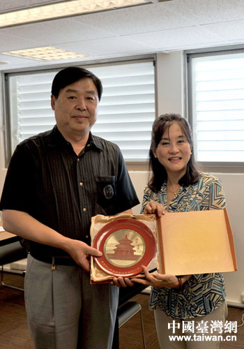 北京市臺辦副主任高振生和臺中市新聞局局長石靜文交換禮物。