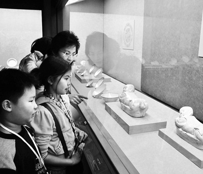 近日,臺北故宮館藏定窯瓷器特展開幕,臺北故宮精選132件作品展出,公眾可近距離感受定窯瓷器的風采。定窯為我國宋代著名瓷窯之一,其白瓷作品頗受推崇。圖為1月10日觀眾在展廳內觀看定窯嬰兒枕。吳景騰攝(新華社發)