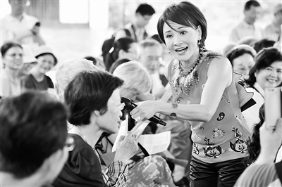 5月24日,臺北市林安泰古厝民俗文物館舉辦“吟詩饗宴”活動,邀請臺灣老、中、青三代詩人聯袂演出,共同迎接端午節的到來。圖為臺灣歌仔戲名家、臺灣戲曲學院歌仔戲系教授黃香蓮帶領觀眾一同吟唱古詩文。吳景騰攝(新華社發)