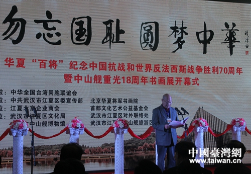 中國臺灣網3月26日武漢訊 勿忘國恥,圓夢中華。今天,華夏百將紀念中國抗戰和世界反法西斯戰爭勝利70周年暨中山艦重光18周年書畫展,在中山艦博物館開幕。