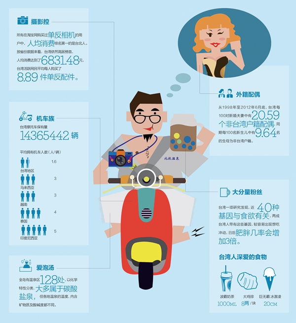 臺灣人為什么成為臺灣人,大概和下述幾點有關。開著“小綿羊”與同伴談論政治娛樂八卦,買杯波霸奶茶,或點一大份雞排,深愛泡湯和攝影。機車、美食、泡湯,成為臺灣人生活方式的重要組成部分。(圖片來源:外灘畫報)