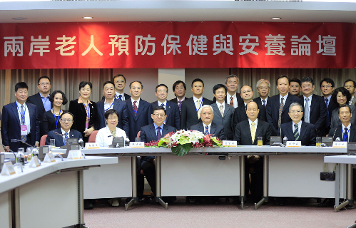 “兩岸老人預防保健與安養論壇”1日在臺灣桃園長庚大學舉行。圖為大陸海協會會長陳德銘與嘉賓合影