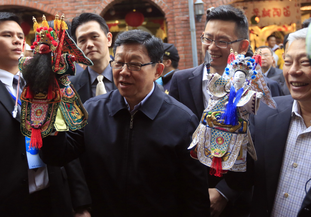 海協會會長陳德銘一行3日前往臺灣宜蘭,參訪傳統藝術中心,體驗布袋戲等傳統文化。