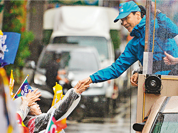 國民黨“大選”候選人朱立倫(右)6日到新北市新店區(qū)車隊(duì)掃街拜票,滂沱大雨無阻支持者的熱情。