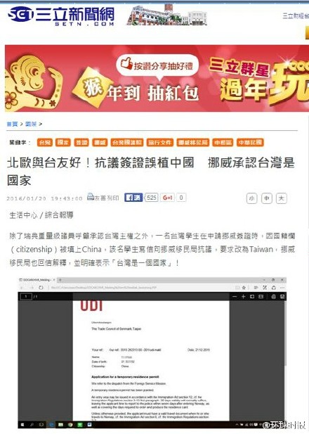 臺媒“三立新聞網”1月20日發文章稱,“挪威移民局承認臺灣是國家”,針對此事,《環球時報》記者獨家采訪了挪威外交部,挪威外交部媒體負責人福爾德?奧弗蘭?安德森答復《環球時報》稱,“挪威自1970年代以來,就一直堅持一個中國的立場,這一立場不會改變。我們會就此事件與挪威移民局進行溝通。”