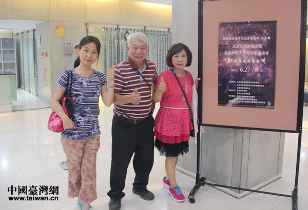 臺北觀眾陳先生、鐘女士(右)與楊小姐(左)散場后在演出海報前拍照留影,要把照片發上臉譜網(facebook),將北京學子送來的精彩和感動傳遞給更多臺灣民眾。(中國臺灣網 王思羽 攝)