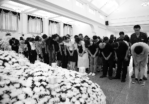 上午9時,殯儀館告別廳內,哀樂低沉,“7·19事故”遇難者公祭儀式正式開始。23名遇難者的遺像依次排列在靈堂前鮮花叢中。遺像上方的橫幅上寫著:“沉痛悼念‘7·19事故’遇難市民”。