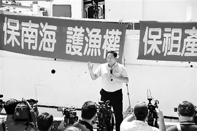 臺灣漁民日前自發(fā)前往太平島護(hù)漁權(quán),竟遭臺當(dāng)局阻撓打壓。圖為漁民出發(fā)前演講。(資料圖片)