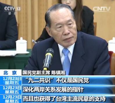 國民黨副主席陳鎮湘:“九二共識”不僅是國民黨深化兩岸關系發展的指針,而且也獲得了臺灣主流民意的支持。雖然本黨目前處境艱辛,但是我們力求維護臺海和平穩定、造福兩岸民眾福祉的決心不會改變。