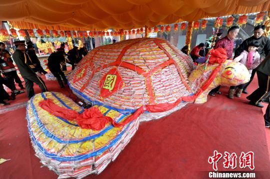 而在泉州筍江橋頭旁的霞洲媽祖宮內,重4.8萬多斤的大“米龜”也已制作完畢。用菠蘿、香蕉、紅蘿卜等果蔬制作而成的兩只水果龍及一批小米龜、果凍龜、旺來龜?shù)确謩e擺放在媽祖宮大殿前后,供市民前來觀賞。