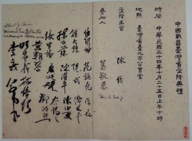 從1945年8月15日日本天皇宣布無條件投降至“中國戰區臺灣省受降典禮”(圖二:受降典禮簽名薄)舉行的10月25日,其間的70天常被稱為“空白期”。實際上,從1945年9月1日起,已有中國官方和軍方人員到達臺灣并開始工作。當年的《大公報》記者李純青在《臺北散記》里說:“第一批去臺灣的有三個人,福建省顧問黃澄淵,中美合作所黃昭明,三民主義青年團張士德,他們9月1日到達臺北,次為中國空軍,再次乃是前進指揮所”。