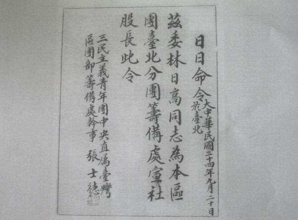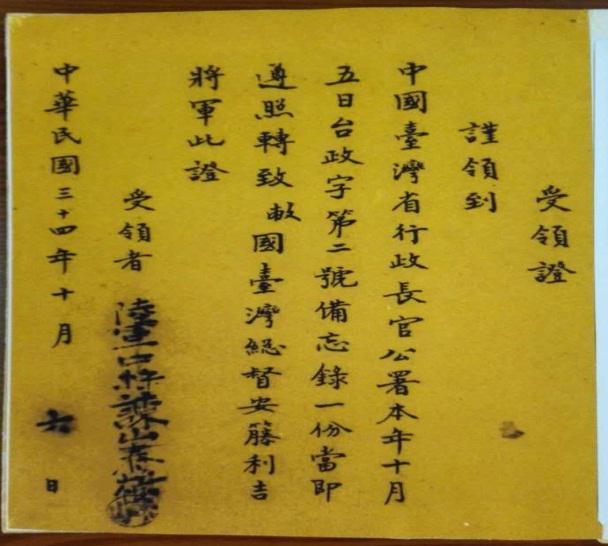據我所知,黃澄淵曾于1937年任福建上杭縣長、1938年任福建古田縣長、1941年任福建仙游縣長。1945年9月1日以福建省政府顧問名義隨美軍陸軍駐閩軍務處三名上尉軍官到臺慰問并解救拘留在臺的1300余名盟軍俘虜,此項工作“于10日之內完成”;黃昭明是中美合作所閩南指揮部的上校參謀;張士德是臺灣義勇隊上校副總隊長,時以“三青團臺灣區團部籌備處干事”的名義到臺,并即征收團員、組建機構、任命干部,他給林日高的任命書是1945年9月20日簽發的(圖三)。至于“中國空軍”部隊,其駐地在臺南,首長為“張司令”;“前進指揮所”是臺灣省行政長官公署和臺灣省警備司令部的先遣隊,于10月4日到達臺北并即辦理公務,10月6日,侵臺日軍參謀長諫山春樹受領“中國臺灣省行政長官公署本(1945)年10月5日臺政字第二號備忘錄”(圖四:《受領證》)。諫山春樹后來作為戰犯被判無期徒刑。另外,“美國陸軍駐閩輔助空軍地面軍務總處主任秘書”陳鏡秋等人也在9月間到了臺灣。而陳孔達中將率領的“國軍70軍”是9月17日到達臺灣的。