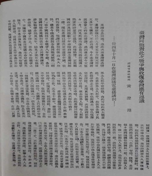 據檔案記載,中國官方先后于1945年11月10日、16日、18日、20日和27日正式接收臺北、臺中、臺南、嘉義和花蓮電臺。然而,1945年10月1日,黃澄淵已在“臺灣廣播電臺播講”《臺灣同胞對此次戰爭與收復臺灣應有認識》(圖五)。我想,在“正式接收”之前應該有官方人員介入做“非正式”接收也。