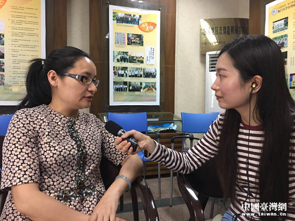 廈門大學臺灣研究院兩岸關系研究所所長張寶蓉(左)接受記者李金鑫采訪。