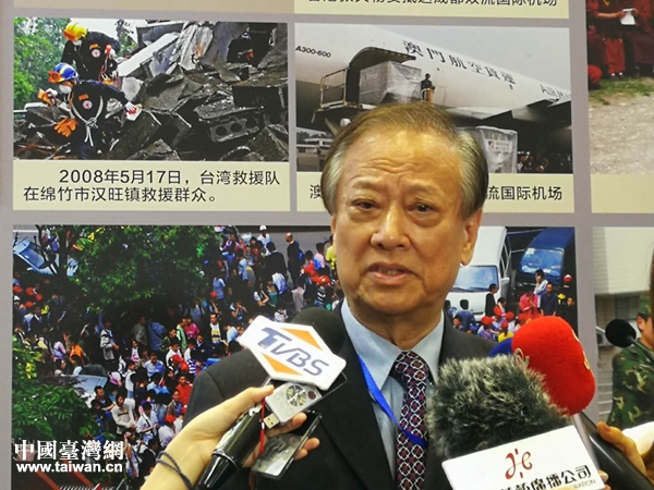 “5.12”地震臺灣救援隊隊長歐晉德觀看災區發展振興成就展,并在“臺灣救援隊在綿竹市漢旺鎮救援群眾”照片前接受兩岸媒體采訪。(圖片來源:四川省臺辦)