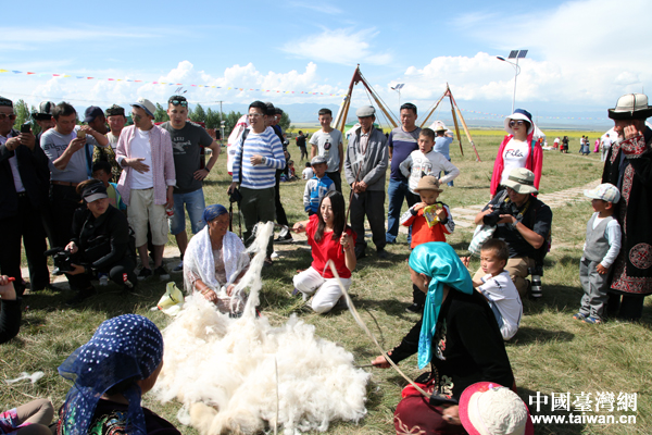 臺灣旅游節目達人呂憶雯(紅衣者)體驗抽打羊毛。(中國臺灣網 王怡然 攝)