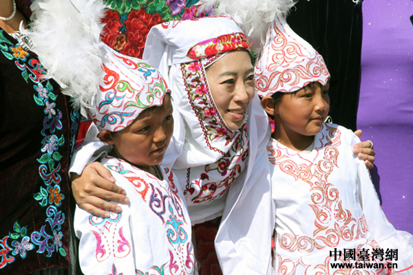 臺灣旅游節目達人呂憶雯頭戴哈薩克族披巾和小朋友合影。(中國臺灣網 王怡然 攝)