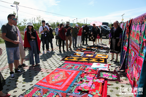 村民向采風團成員推銷哈薩克族羊毛毯。(中國臺灣網 王怡然 攝)