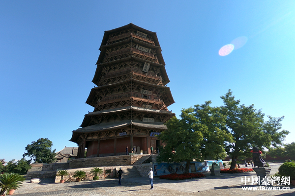 全部榫卯結(jié)構(gòu)建筑的應(yīng)縣木塔外景。(中國臺灣網(wǎng) 袁楚 攝)