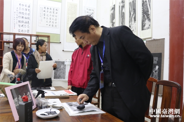 記者體驗拓片制作。(中國臺灣網(wǎng) 李寧 攝)