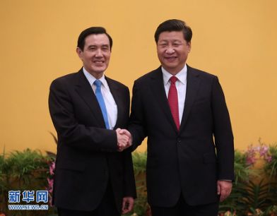 2015年11月7日,兩岸領導人會面在新加坡香格里拉大酒店舉行。習近平同馬英九握手。 新華社記者 蘭紅光 攝