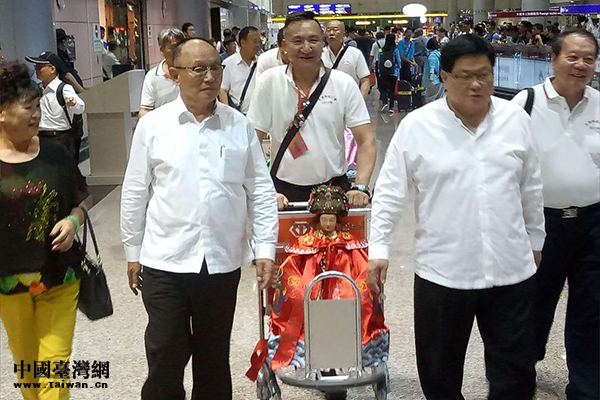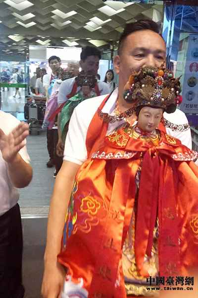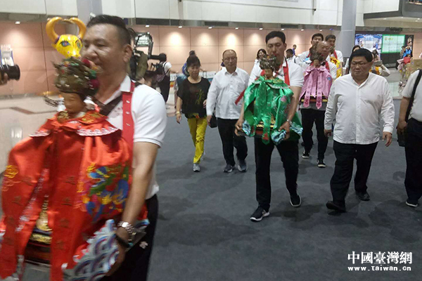 兩岸宮廟人士護送媽祖走出機場。(中國臺灣網 發)