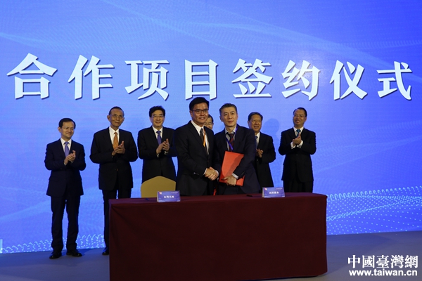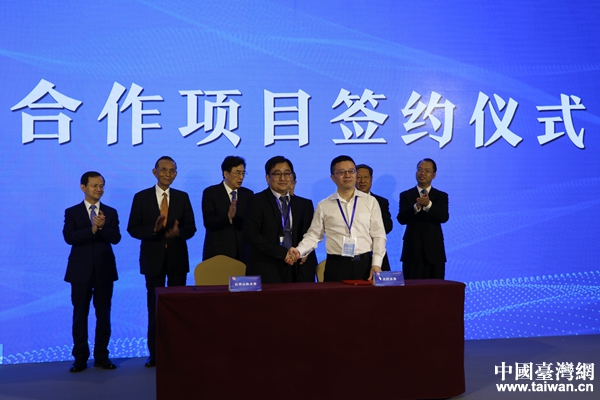 已達(dá)成合作協(xié)議的兩岸金融、保險及高新技術(shù)企業(yè)在簽約儀式上進(jìn)行簽約,正式開展合作。(完)