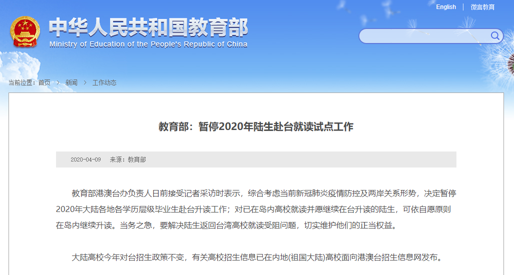 日前,教育部港澳臺辦負責人表示,綜合考慮當前新冠肺炎疫情防控及兩岸關系形勢,決定暫停2020年大陸各地各學歷層級畢業生赴臺升讀工作;對已在島內高校就讀并愿繼續在臺升讀的陸生,可依自愿原則在島內繼續升讀。