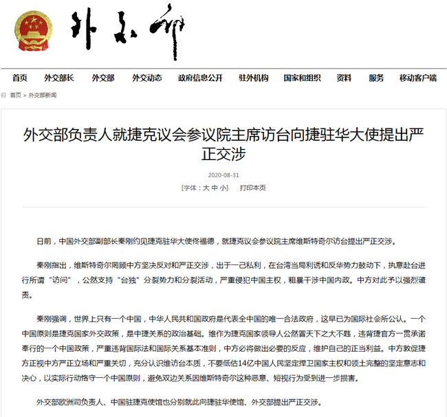 外交部負責人就捷克議會參議院主席訪臺向捷駐華大使提出嚴正交涉。(外交部網站截圖)
