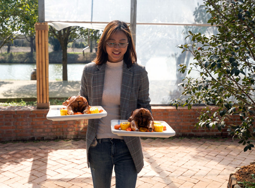 謝丞恩在農(nóng)場(chǎng)內(nèi)給參觀的客人端上烤雞。新華社記者 季春鵬 攝