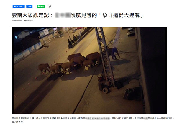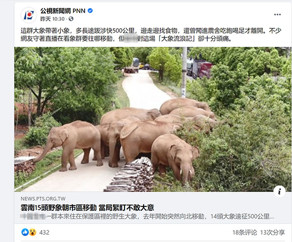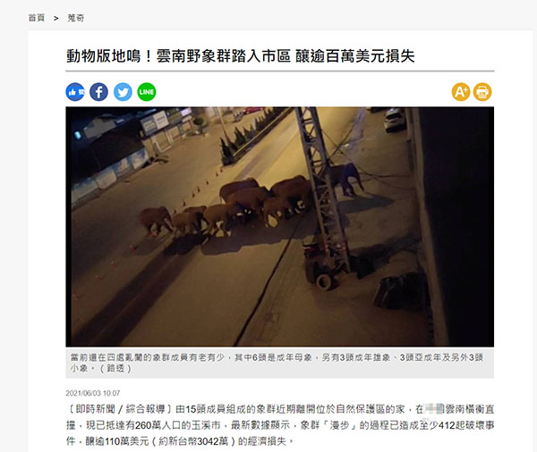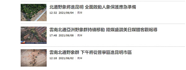 由17頭亞洲野象(含中途出生的一只小象)組成的“遷徙大軍”自云南西雙版納出發(fā),一路往北方前進,超過400多公里、歷時一年多終于進入到了昆明,引發(fā)全球關注。島內(nèi)包括“中央社”、《聯(lián)合報》、“中時新聞網(wǎng)”、《自由時報》、公視新聞等在內(nèi)的各家媒體發(fā)布多篇文章追蹤事件進展。