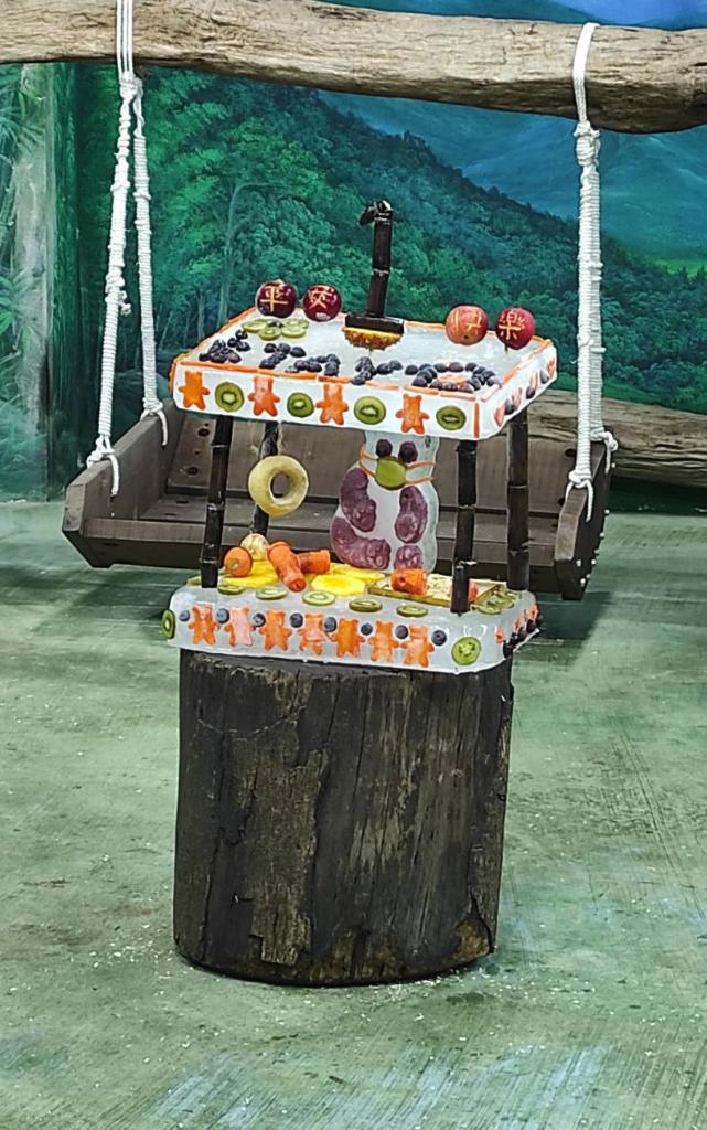 保育員精心設計了雙層冰塊蛋糕,上面有用蘋果雕刻的“平安快樂”四個字和用葡萄鋪成的“stay home”字樣。園方說,這些祝福也是希望眼下臺灣的新冠疫情早日結束,大家生活恢復正常。最上層的“1”字形甘蔗,象征周歲與愛的祝福。冰雕小熊置于中間并戴上奇異果雕花口罩,旁邊掛上窩窩頭做成的輪胎圈等“圓寶”喜歡的玩具,口罩與水果雕成的酒精噴罐是要提醒大家加強自我防疫。