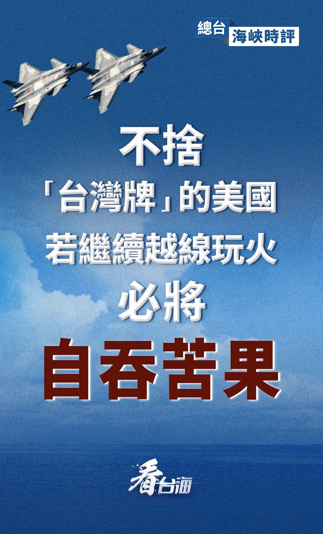 中國在臺灣問題上的原則立場已經闡述得非常清楚,正如外交部發言人趙立堅23日再次強調的:中方捍衛國家主權和領土完整的決心堅定不移。也正如中國人民解放軍一直以來所行動的:將采取一切必要措施,堅決反制一切威脅挑釁,堅決捍衛國家主權和領土完整。奉勸美方立即糾正錯誤,停止打“臺灣牌”,多為地區和平與穩定發揮建設性作用,倘若一再在臺海尋釁滋事,中國人民解放軍必將讓其付出代價。(據中央廣播電視總臺臺海之聲)