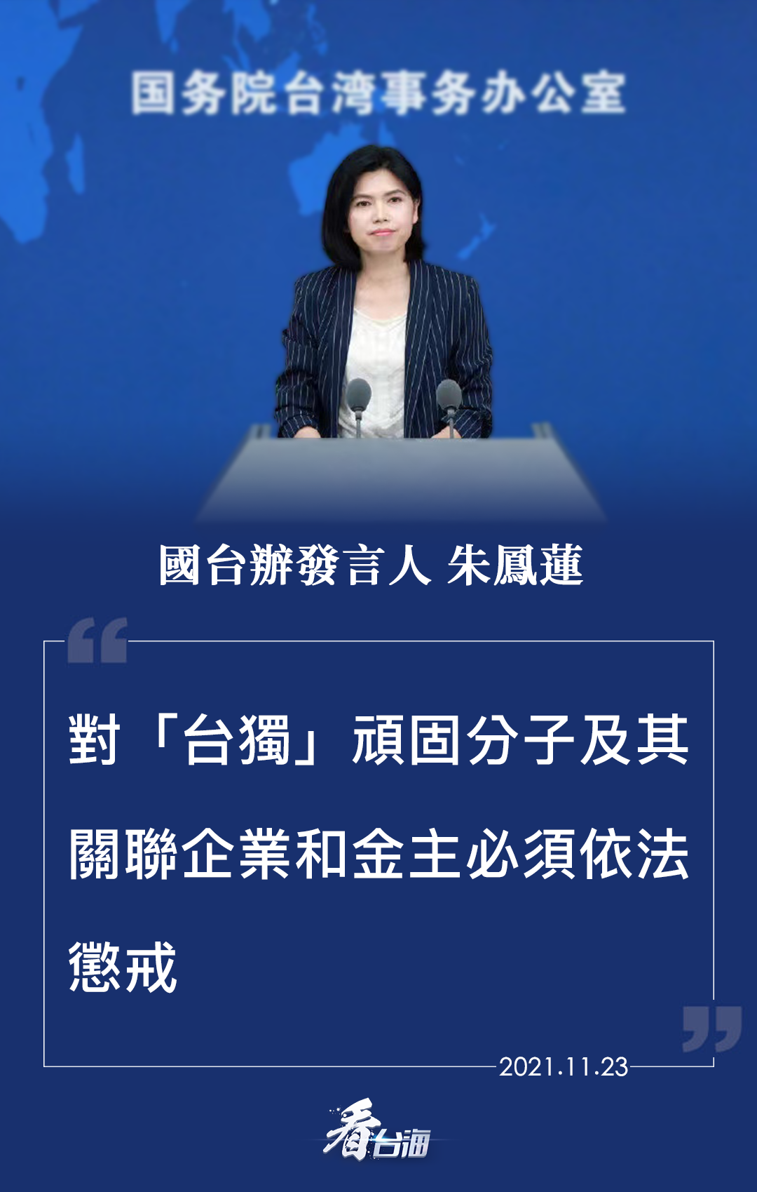 11月22日,上海、江蘇等省市執法部門對臺灣遠東集團在當地投資企業存在違法違規行為進行了查處。消息一出,立即引發網絡熱議。對此,國臺辦發言人朱鳳蓮再次強調,對“臺獨”頑固分子及其關聯企業和金主必須依法懲戒!俺燥堅义仭钡闹С帧芭_獨”者必須付出代價!