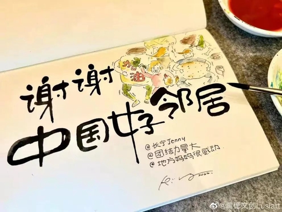 很快,簡美霜創作了一副手繪:一位大叔抱來了大大的土豆,一位阿姨手里攬著一只雞,有人抱著加油瓶,還有人送來了一袋米……中間則寫著幾個字:謝謝中國好鄰居。