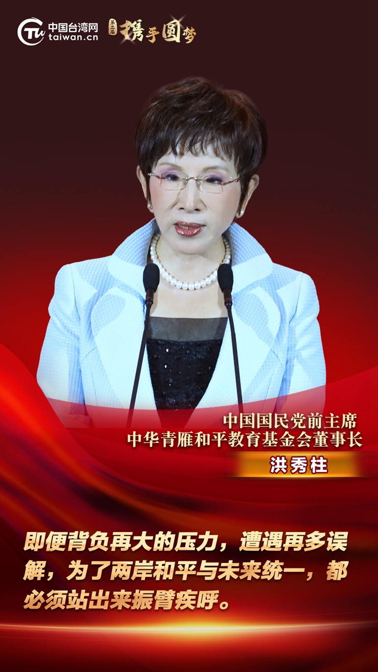 第二屆“攜手圓夢——兩岸同胞交流研討活動”7日在北京開幕。中國國民黨前主席、中華青雁和平教育基金會董事長洪秀柱在致辭時表示,即便背負再大的壓力,遭遇再多誤解,為了兩岸和平與未來統一,都必須站出來振臂疾呼。