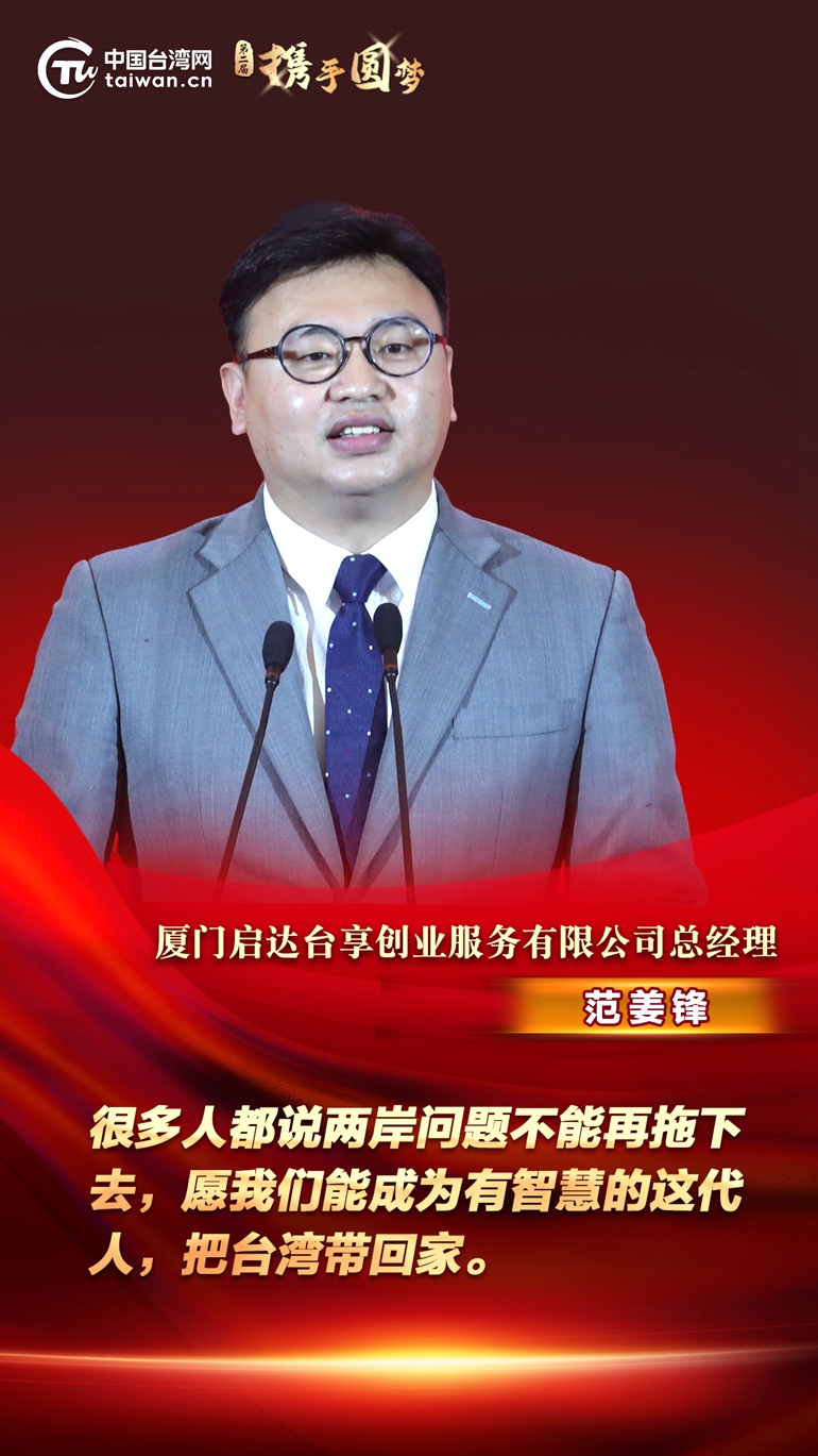 第二屆“攜手圓夢——兩岸同胞交流研討活動”7日在北京開幕。廈門啟達臺享創業服務有限公司總經理范姜鋒在致辭時表示,很多人都說兩岸問題不能再拖下去,愿我們能成為有智慧的這代人,把臺灣帶回家。