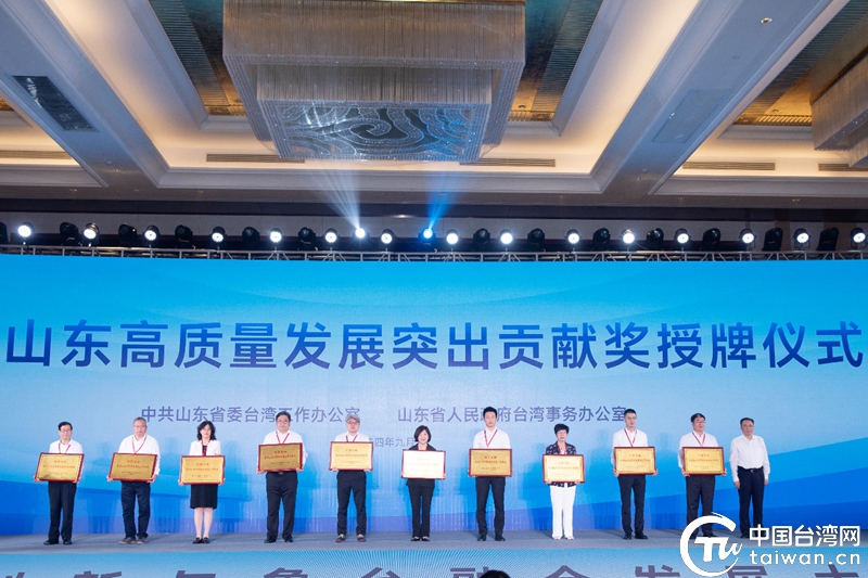 產業(yè)創(chuàng)新與魯臺融合發(fā)展大會上,20位在魯臺資企業(yè)、創(chuàng)業(yè)臺青代表獲頒“助力山東高質量發(fā)展突出貢獻獎”紀念牌。(中國臺灣網記者 陳佳慧 攝)