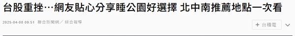 臺股受“對等關稅”沖擊重挫,讓不少人的資產大幅縮水,許多股民哀號自己要睡公園了。據臺灣“聯合新聞網”報道,有臺灣網友在社交媒體上分享自己睡公園的經驗,并分析臺北、新竹、臺中、高雄等地的哪些公園比較好睡,給眾人做參考。甚至連家樂福超市都“貼心”地推出睡公園套組,包括蚊香、飲料、白吐司和泡棉地墊。