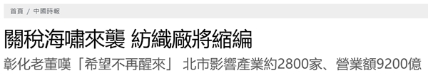 受沖擊的不止股市,也延伸到各行各業。不止高科技產業,許多中小企業也都遭殃。一家彰化老字號紡織工廠傳出將縮編、放無薪假因應,廠家負責人表示近年來訂單大幅縮減,關稅提高恐成最后一擊。他說:“真希望睡了就不用再醒來!”