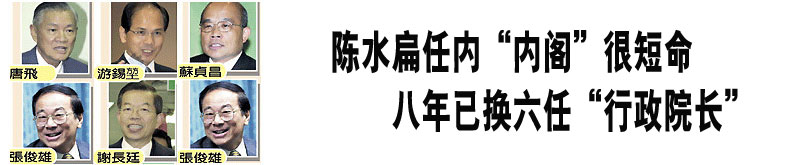 聲稱要打造“戰斗內閣”的第三任“行政院長”是最聽陳水扁話的游錫堃,不過他的施政能力也是外界公認最差的,有人稱他是“七品的能力做了一品的官”。因為最能貫徹陳水扁的意圖,游錫堃在幾位“行政院長”中任期最長。但經濟遲遲沒有起色,民眾怨聲載道,2004年年底“立委”選舉,泛藍獲得過半席位,民進黨選舉成績不如預期,他被迫于2005年1月黯然下臺。 |