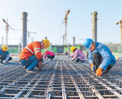 2月17日,在山東省菏澤市魯南高鐵菏澤東站施工現(xiàn)場,工人們正在作業(yè)。李保珠攝(影像中國)