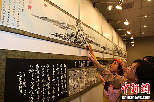 資料圖:3月7日下午,出自大陸名家之手的長幅剪紙藝術作品《富春山居圖》(上)、《清明上河圖》,一同亮相張家口蔚縣民俗文化藝術展,吸引臺灣民眾駐足欣賞、評頭品足。中新社發 董會峰 攝