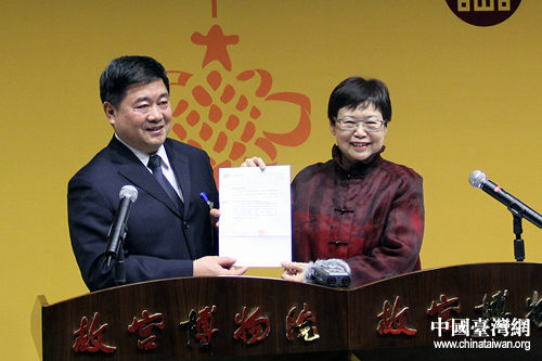 記者會上,馮明珠院長還當面遞交一封邀請函,邀請單霽翔院長年內訪臺。(中國臺灣網記者 楊麗)