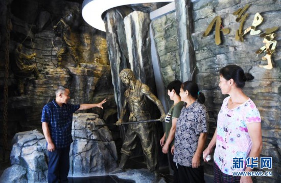 毛相林(右一)在下莊精神陳列館內講述當年修路的故事(2020年7月3日攝)。新華社記者 王全超 攝