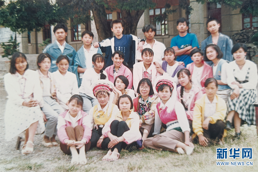 1995年,張桂梅在大理喜洲一中任教,和學(xué)生在一起合影(資料圖)。新華網(wǎng)發(fā)(華坪縣融媒體中心 供圖)
