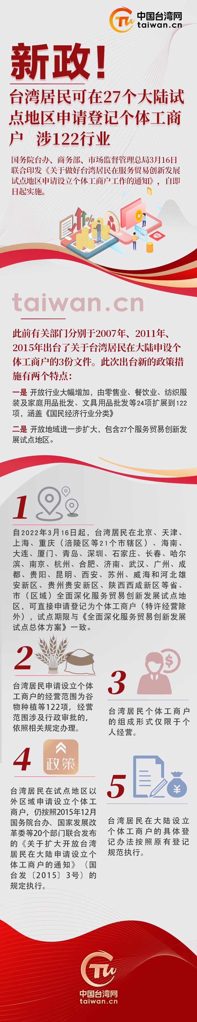 【圖解】新政!臺灣居民可在27個大陸試點地區申請登記個體工商戶 涉122行業