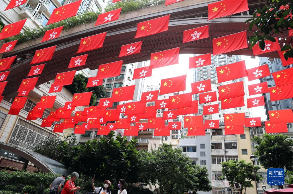 在香港利東街,中華人民共和國國旗和香港特別行政區區旗迎風飄揚(6月16日攝)。新華社記者 李鋼 攝