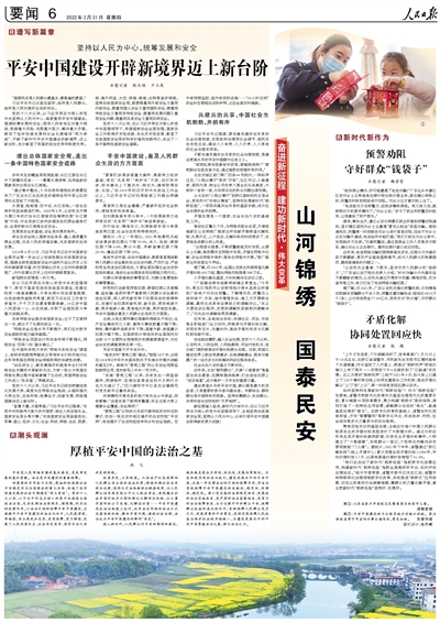 經國序民,正其制度。從依法嚴打各類影響人民群眾安全感的違法犯罪,持續加強社會治安綜合治理,到深化司法體制綜合配套改革,讓人民群眾切實感受到公平正義就在身邊,再到健全社會矛盾糾紛多元預防調處化解綜合機制,讓大量矛盾糾紛止于發端、化解在訴前……平安中國建設在法治軌道上運行,運用法治思維和法治方式完善體制機制、解決矛盾問題、推進社會治理,法治成為平安中國建設的鮮明“底色”。
