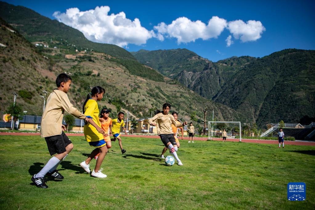 云南省怒江傈僳族自治州瀘水市大興地鎮(zhèn)格力小學(xué)學(xué)生在球場(chǎng)上踢足球(2020年5月18日攝)。新華社記者 江文耀 攝